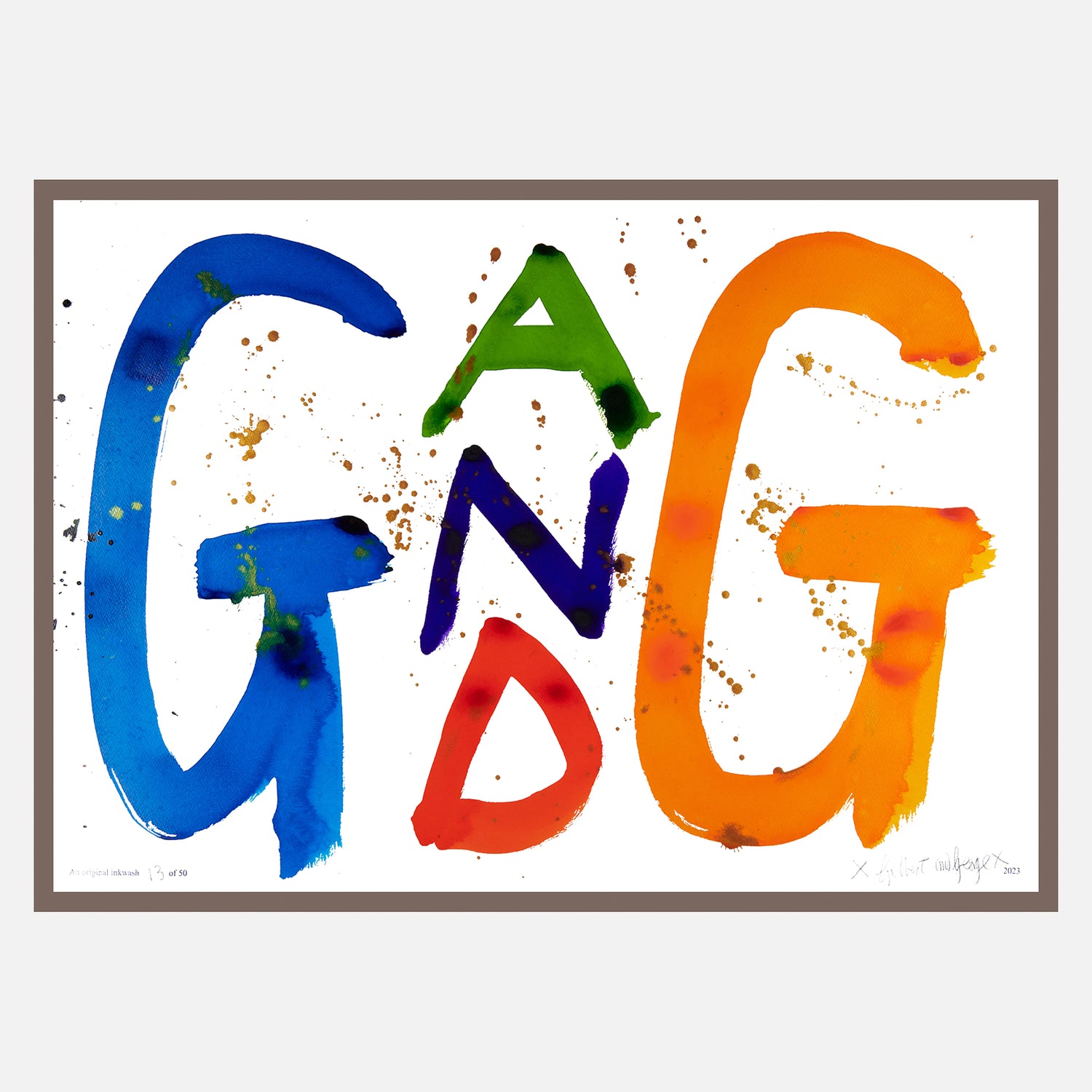 Each edition (of 50) in this suite has been individually hand-painted by Gilbert & George – with each Inkwash featuring distinctive, lively and unique brushwork and colourful lettering on 400 gsm watercolour paper.