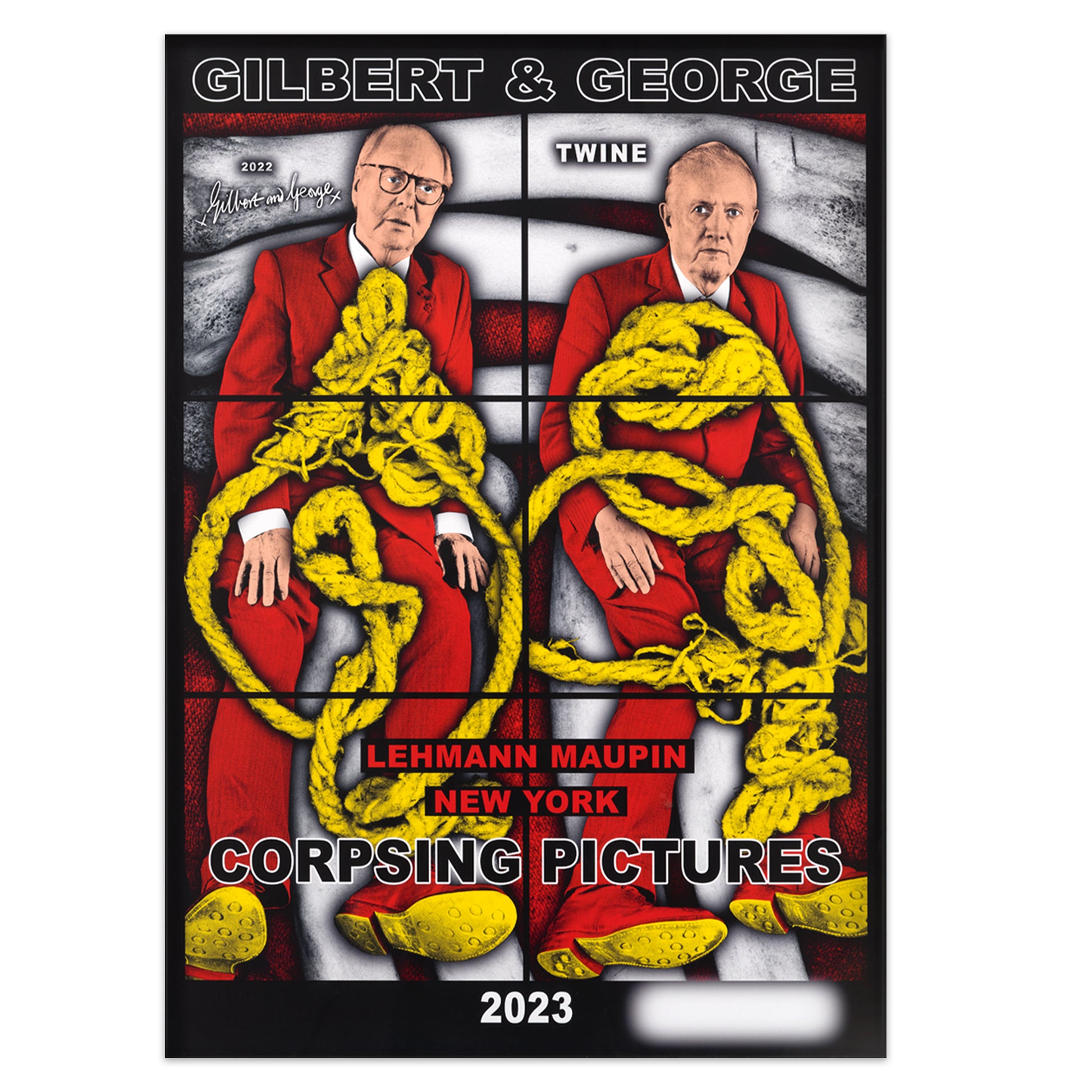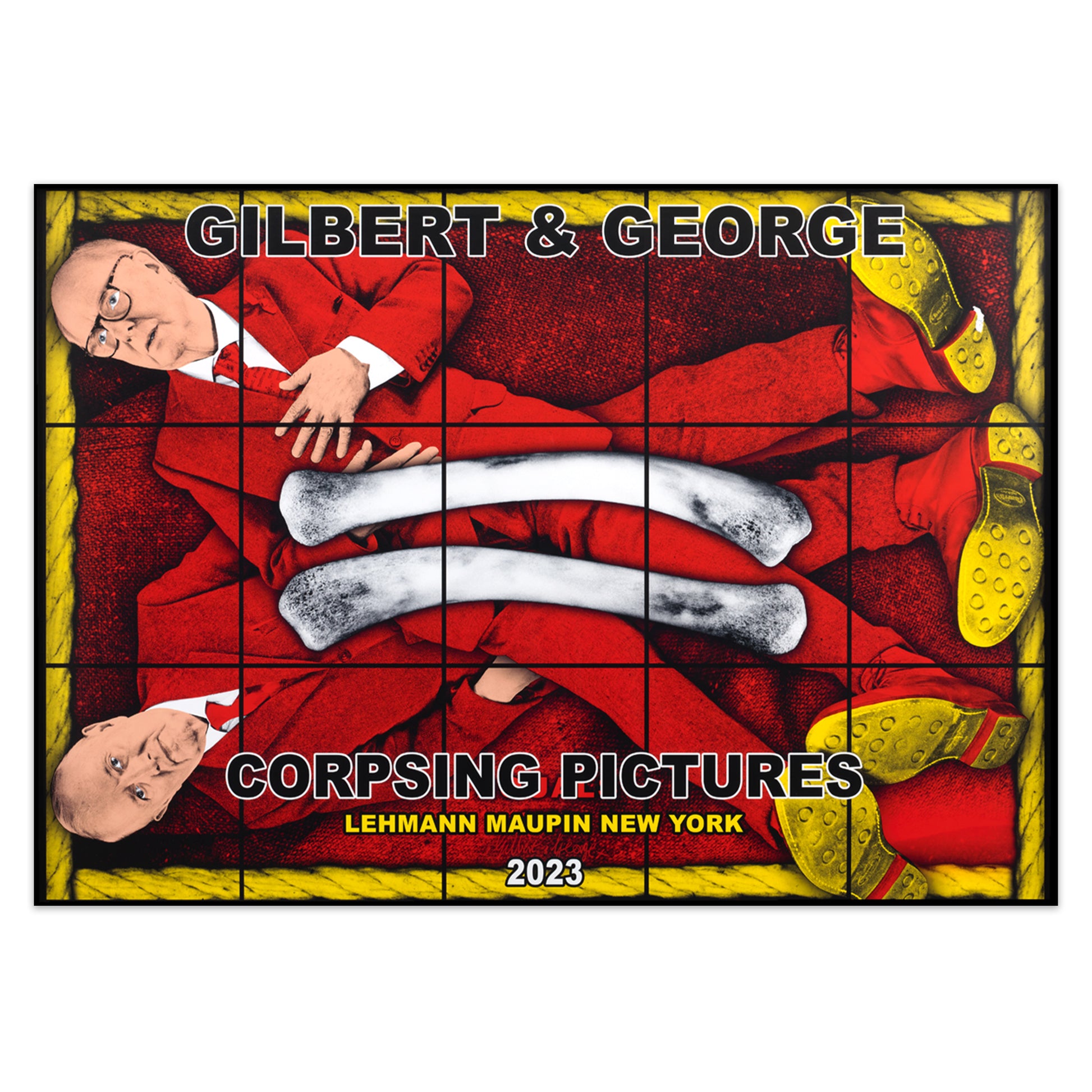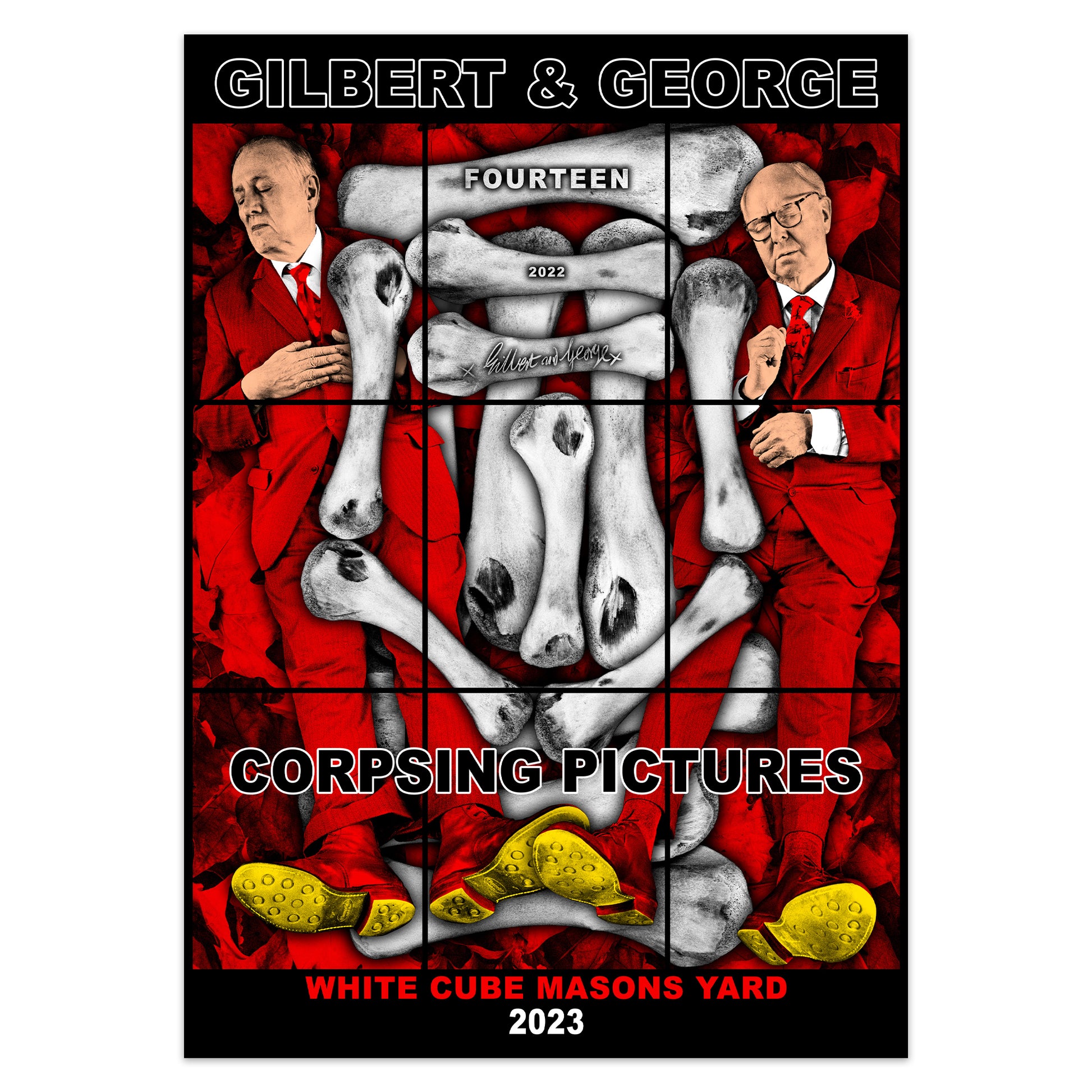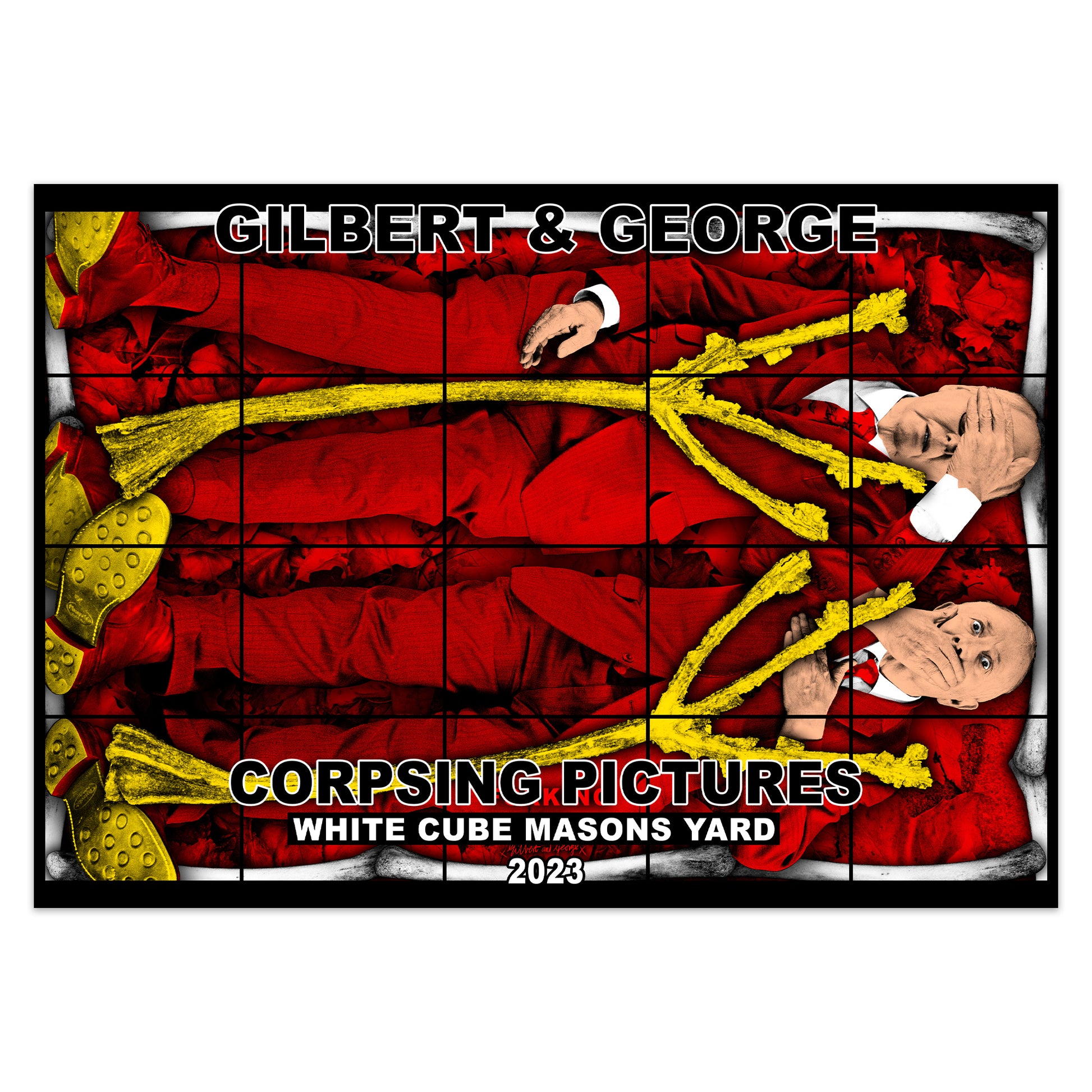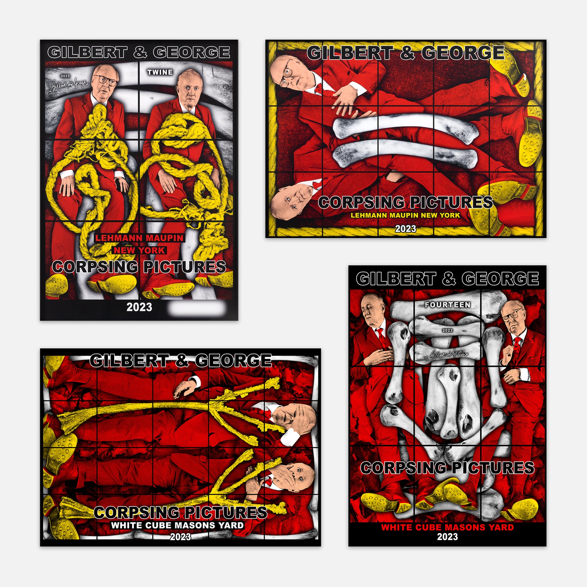 Set of four posters designed by Gilbert & George to accompany their 2023 ‘THE CORPSING PICTURES’ exhibitions at White Cube, Mason’s Yard, London and Lehmann Maupin, New York.